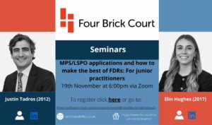 Four Brick Court, Chambers Seminar “Updates and Practical Tips for Deprivation of Liberty (Inherent Jurisdiction) Proceedings.” Please join us for this seminar by Brónach Gordon (Call: 2015) and Sarah Barber (Call: 2018).