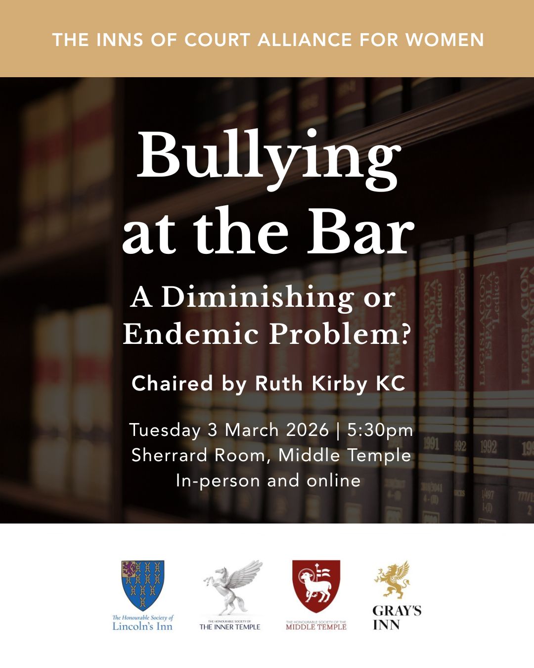 Join members of the committee in the Sherrard Room for a panel discussion led by Middle Temple’s Co-Convenor Ruth Kirby KC alongside those who have experienced and have informed views on bullying at the Bar.